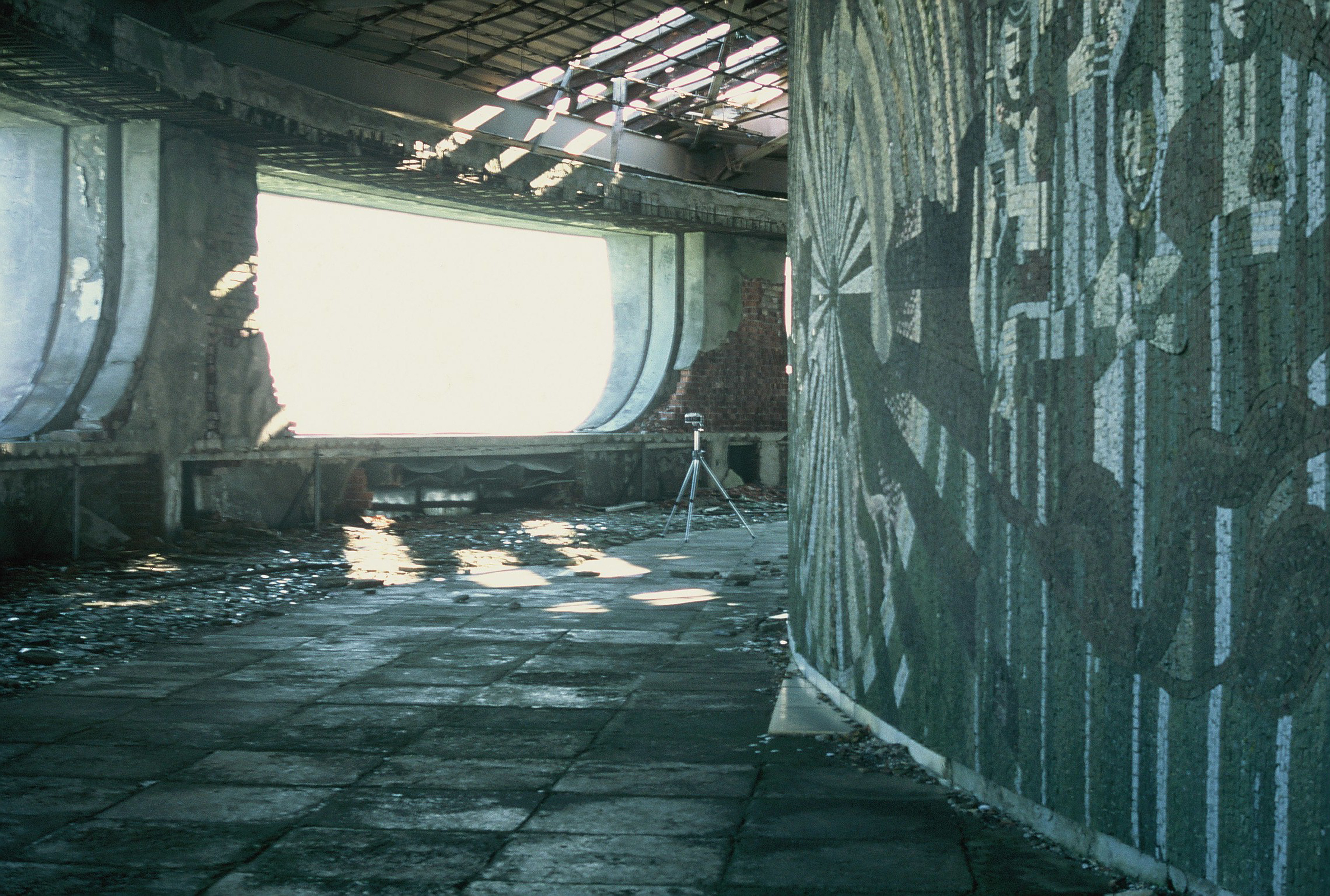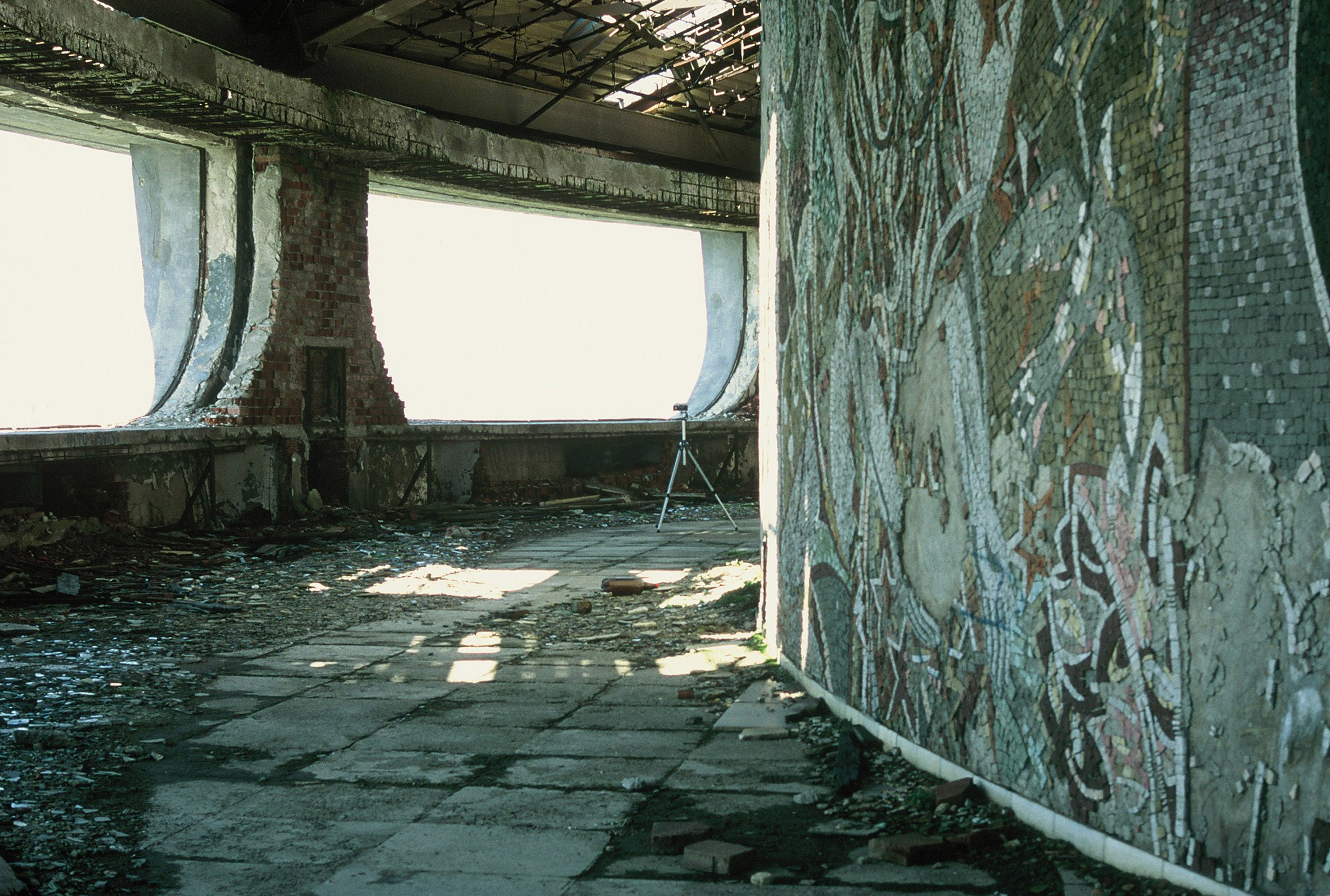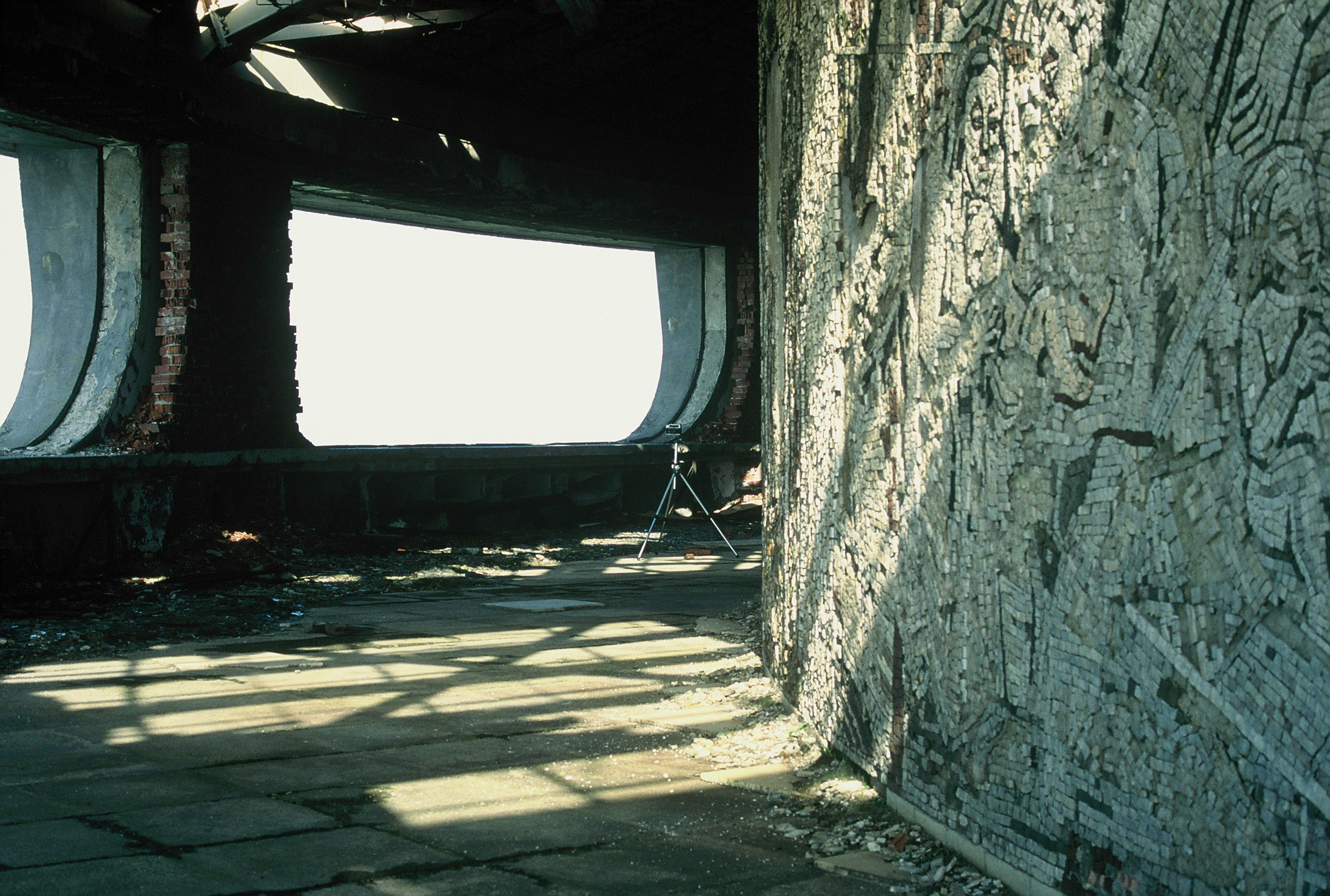 ‘Still’ comprises a 35mm slide carousel projection of eighty continually rotating slides produced in the circular perimeter corridor of Guéorguy Stoilov's Buzludzha Monument, a disintegrating late communist-era structure located in the Buzludzha National Park in Central Bulgaria. Buzludzha Monument opened in 1981 as the meeting house for the Bulgarian Socialist Party but was last used in 1989 prior to the 1990 Bulgarian Constitutional Assembly elections (10th June – 17th June) that finalised the fall of Communism, in Bulgaria. I produced the images with two cameras over the course of 24 hours on the 13th of June 2013. To make the work. I used each camera to take shots of the other, moving in a clockwise direction around the circumference of the Monument. The process continued over the course of a whole day. I took photos every 18 minutes until I had produced 80 images, sufficient to fill a slide carousel.
